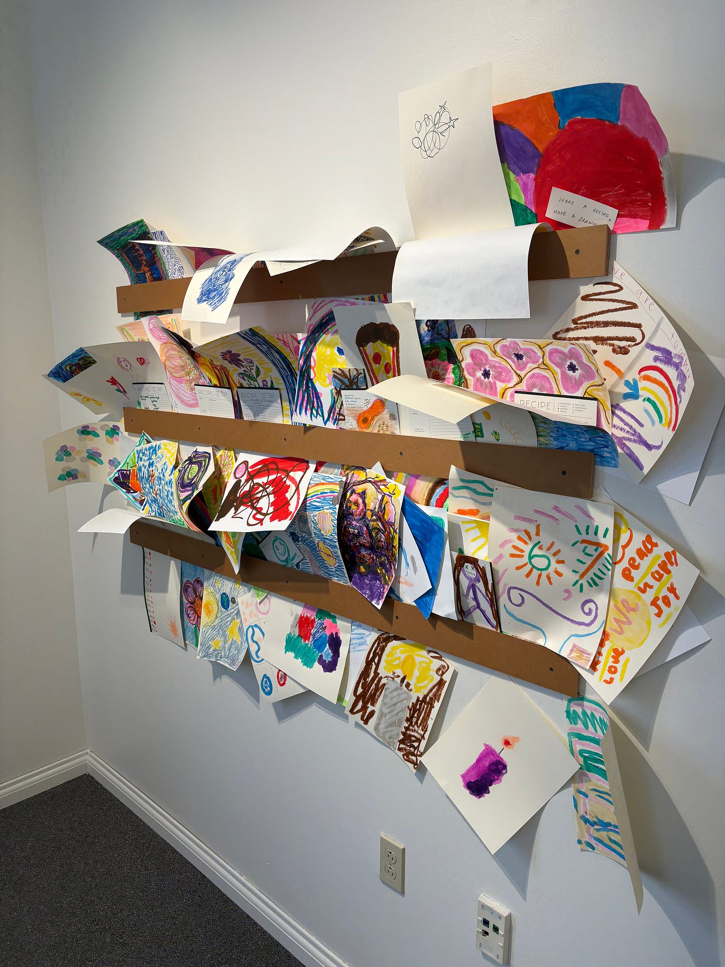 Near the side of the gallery, a table was set out with art supplies, blank recipe cards, and paper. Visitors were invited to make something of their own, to contribute a recipe, a drawing, a story, and add it to the exhibit. The wall beside it was already covered in colorful pages from people who had come before me, children’s drawings alongside handwritten recipes alongside abstract marks in crayon.