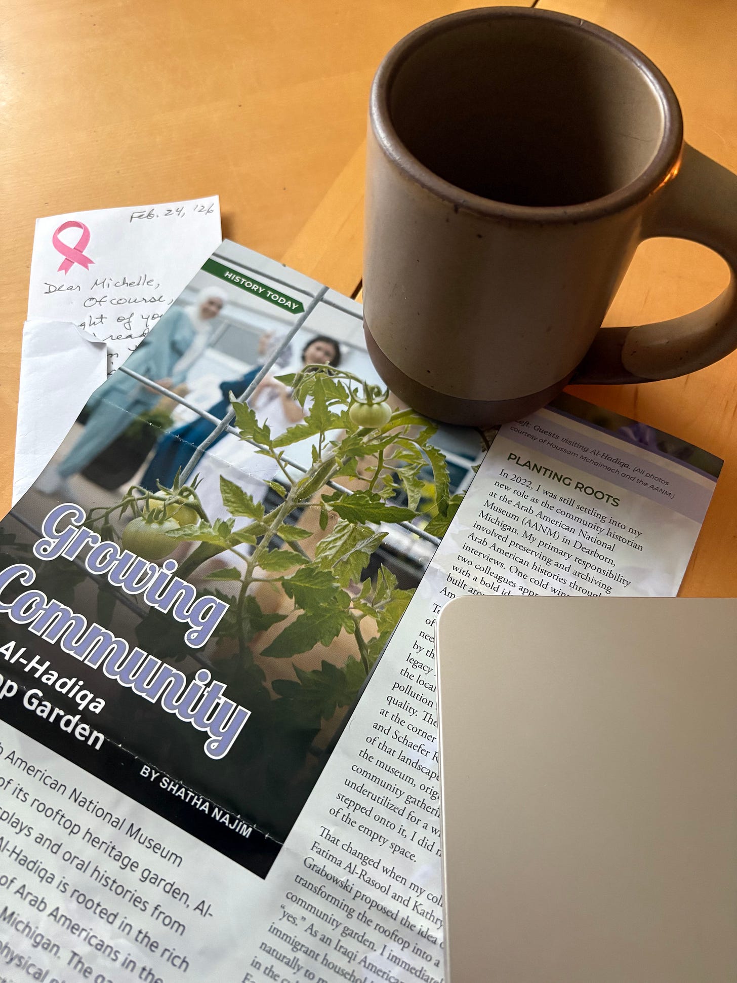 Al-Hadiqa, "the garden" in Arabic, sits on the rooftop of the Arab American National Museum in Dearborn, Michigan, home to one of the largest Arab American communities in the country. The garden grows plants, vegetables, and herbs from across the Arab world: Aleppo peppers from Syria, Iraqi heart tomatoes, Armenian cucumbers, za'atar, figs. Many of the seeds were carried back by community members from their homelands, including one woman who brought mulukhiyya seeds from Palestine in 2023. Alongside the plants, the garden includes oral history displays: photos of Dearborn residents who donated seeds, with audio recordings of their stories about gardening as ancestral practice, as a form of memory, as a way of feeling at home in a new place.