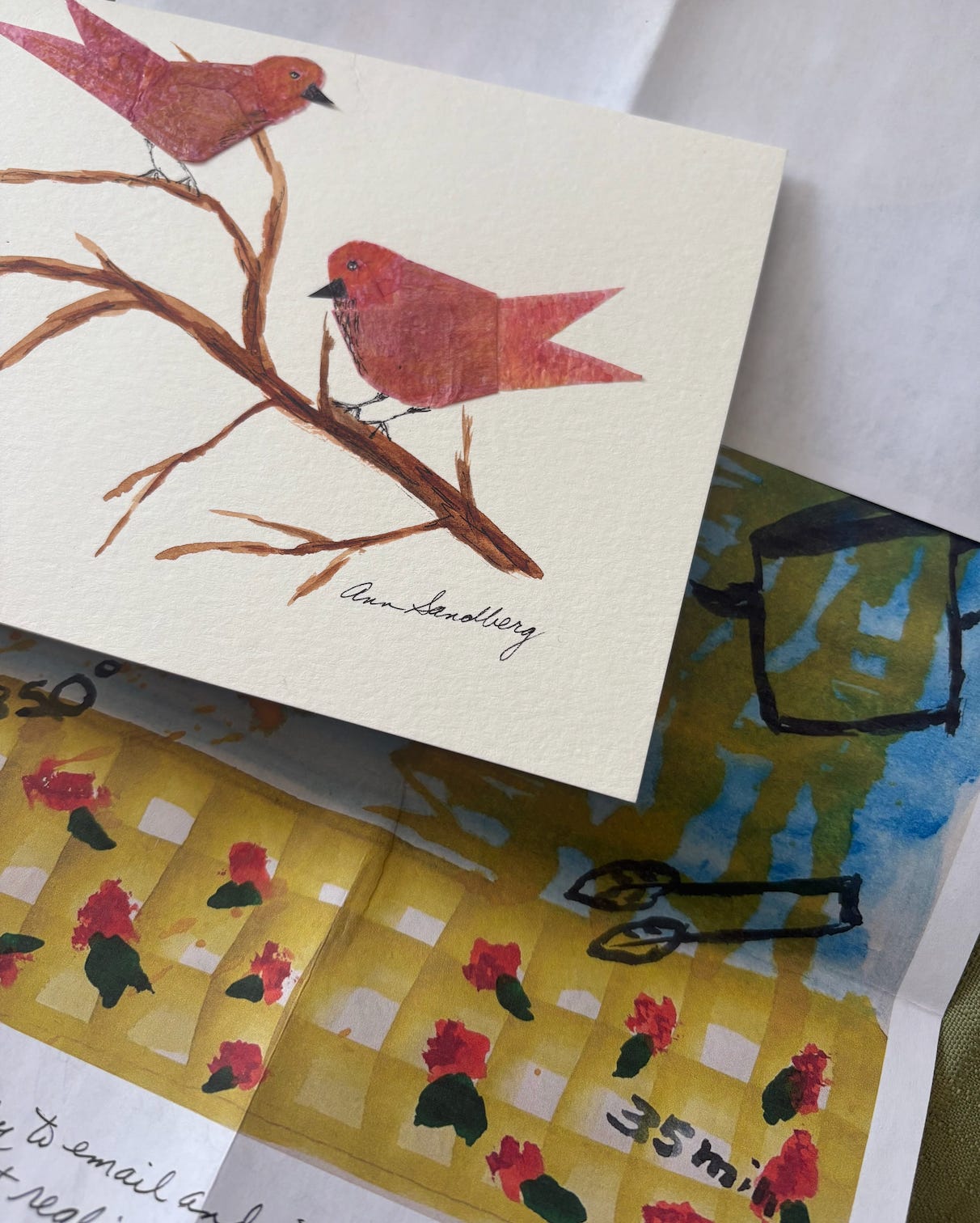 One of my favorite parts of writing this newsletter is what comes back to me. Recently I received a handmade card in the mail from Ann, a longtime reader, friend, and artist who attended the opening of Emily Lanctot’s Salaiset Ruokaohjeet exhibit at the Finlandia Gallery, which I wrote about last month. Inspired by the show, Ann and a group of women organized their own gathering around the same idea: a potluck where each person painted their dish-to-pass alongside its recipe. I love everything about this. That a painting of a coffee cake recipe sparked an evening of cooking and making and gathering around a table together. That is exactly the kind of ripple this work hopes to send out. Food is a conduit for connection.