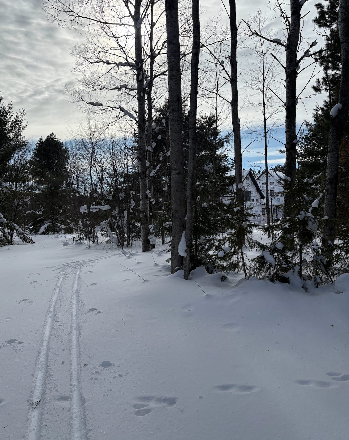 Snow, cold, trees heavy with white. The house visible through bare branches on the return. Movement that belongs to this place, this season, this life.